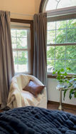 The client is a married female who has lived in her current home for the past 20 years. When she moved into the home, the primary bedroom was one of the first rooms she redecorated. Her taste has since evolved as she has updated the rest of her home in recent years. This project involved refreshing her primary bedroom to more cohesively connect with the open, airy, and more modern feel she has cultivated through her design updates. She wanted to accentuate the high ceilings of the room, enhance and celebrate the natural light from the windows, and replace the current, more traditional styled furniture while leaving the existing wood floor and trim as-is. Room Uses: The room is exclusively used by the client and her spouse. They like to have quiet mornings with coffee in bed and enjoy watching tv in bed in the evenings. Style Preference(s): The client has an eclectic style, lightly leaning into Farmhouse without being too rustic. She likes to incorporate organic and natural elements into her decor. What’s Working: Tall ceilings, natural light, bay window, TV mounted on wall, separate his and hers closets. What’s Not Working: Room size (feels too small), overall Traditional styling feels disconnected from the remainder of home. Must Haves: New closet doors, Fresh and Airy vibe, maintain the height of the ceiling, provide ample lighting and protect the natural light, deliver modern color palette, allow for space for plants. Nice to Haves: New Ceiling Fan, updated wall art, separate seating for morning coffee and enjoying the window view.